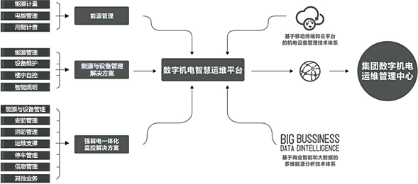 实现总部一键式管理,完成强弱电业务集成,提高能源使用水平,提升运维管理效率。以强弱电一体化监控为基础,对建筑内部各专业系统进行业务集成,以能源管理和设备管理为核心,实现对建筑机电设备的统一管理和优化控制。同时在集团或总部层面建设可面向未来演进的集团级运维中心,实现对下属各类建筑的一键式管理。